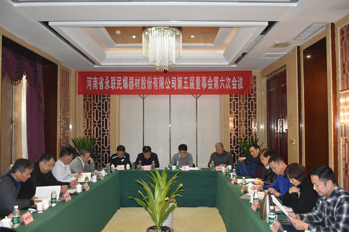河南省永聯民爆器材股份有限公司第五屆董事會第六次會議于2020年1月9日在鄭州市鄭東新區福緣國際酒店召開。會議應到董事11人,實到董事9人;應到監事5人,實到監事5人,符合《公司法》及公司《章程》的有關規定,會議有效。會議由董事長劉嵩同志主持,董事會秘書王虎同志記錄。