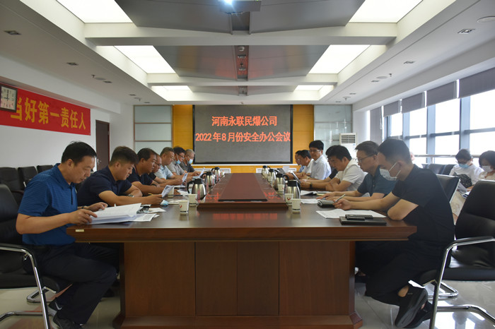 2022年8月26日,河南省永聯民爆器材股份有限公司召開了8月份安全辦公會議,公司領導班子、安委會成員、安委會辦公室成員以及淇縣、光山縣、焦作市、安陽市、內鄉縣、郟縣等6家分公司負責人參加了會議。會議由公司副總經理靳義國主持,公司董事長、總經理劉嵩參加會議并講話。